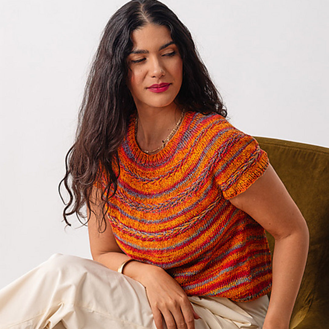 Bright & intriguing, the new Hemlock Tee pattern by Mel Kennelly is a refreshing knit loaded with color & texture. Knit in Berroco Summer Sesame, the tee is knit seamlessly, top down, in the round. The yoke features a slip stitch pattern that creates “woven” bands before transitioning to stockinette stitch.