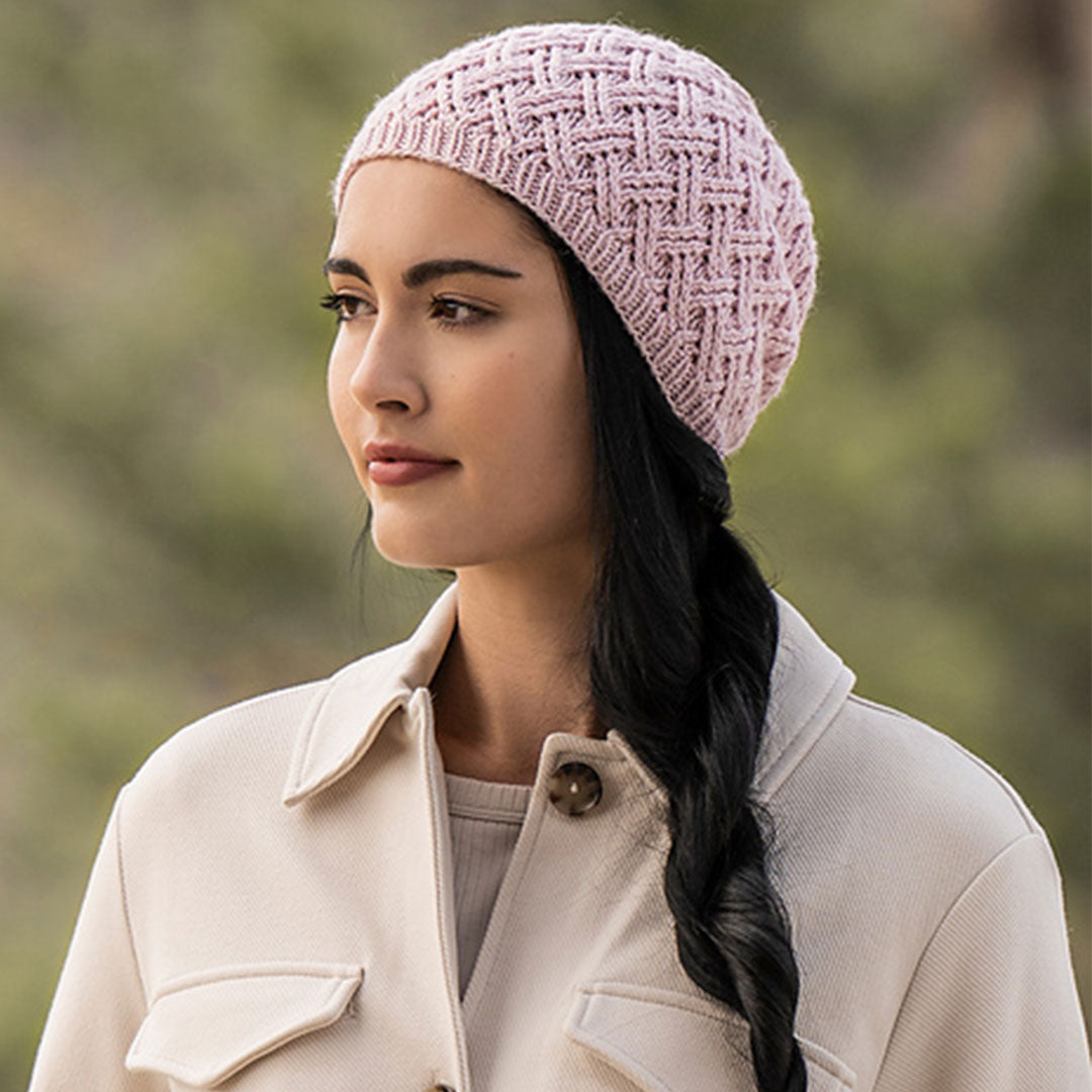 A gorgeous & unique piece, the hat features a double lattice stitch pattern that delivers the basketweave effect. This is a fun, challenging pattern that is considered advanced. It involves lifted increases, as well as a raised twist stitch.