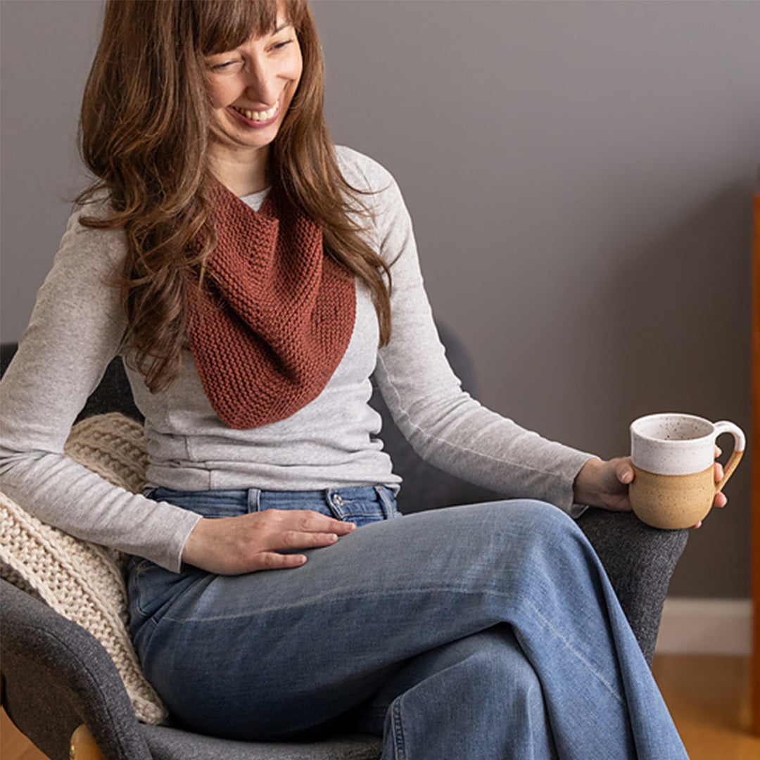 Nice for going out or staying in, the Coffee Break cowl by Elizabeth Smith is a gorgeously soft bandana cowl that is easy to style. Knit seamlessly in the round, the cowl is a relaxing, stress-free project that shows off garter stitch beautifully.