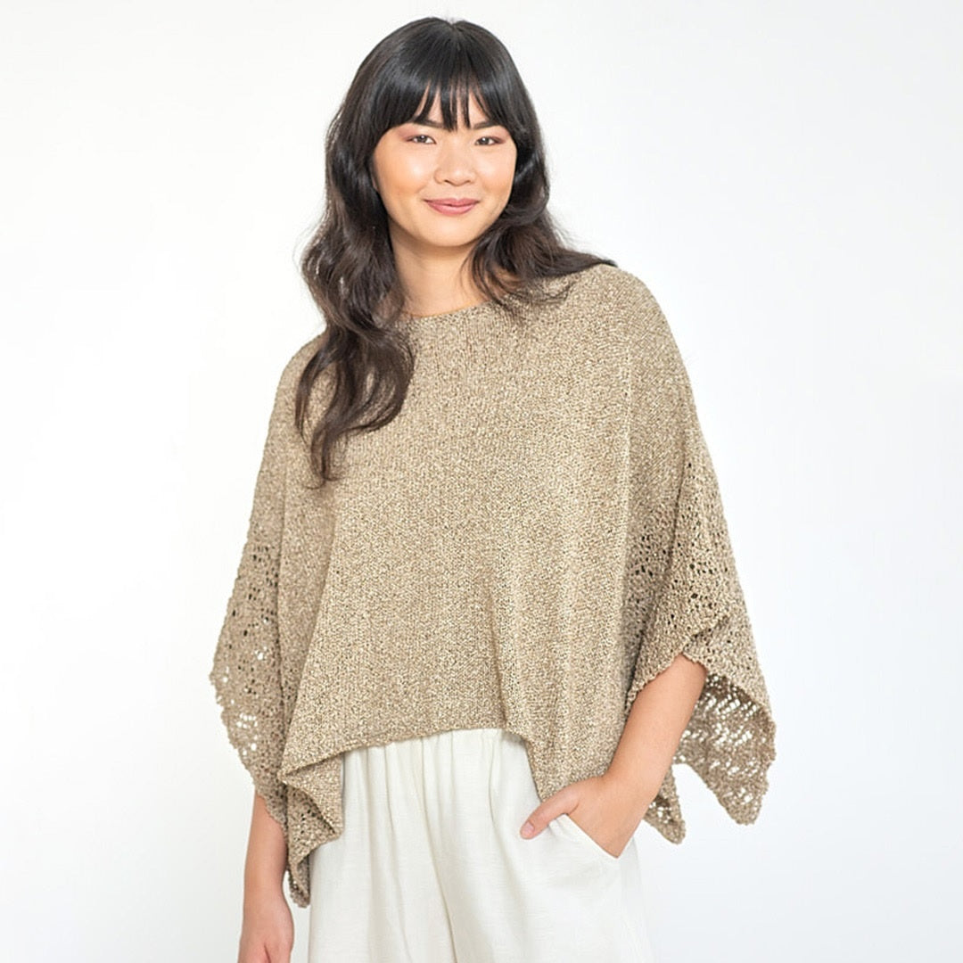 Technically a poncho, the garment is knit flat with the back & front worked separately, then sewn together at the shoulders The neckband is picked up and worked in garter stitch. The open, relaxed fit makes is very comfortable to wear.