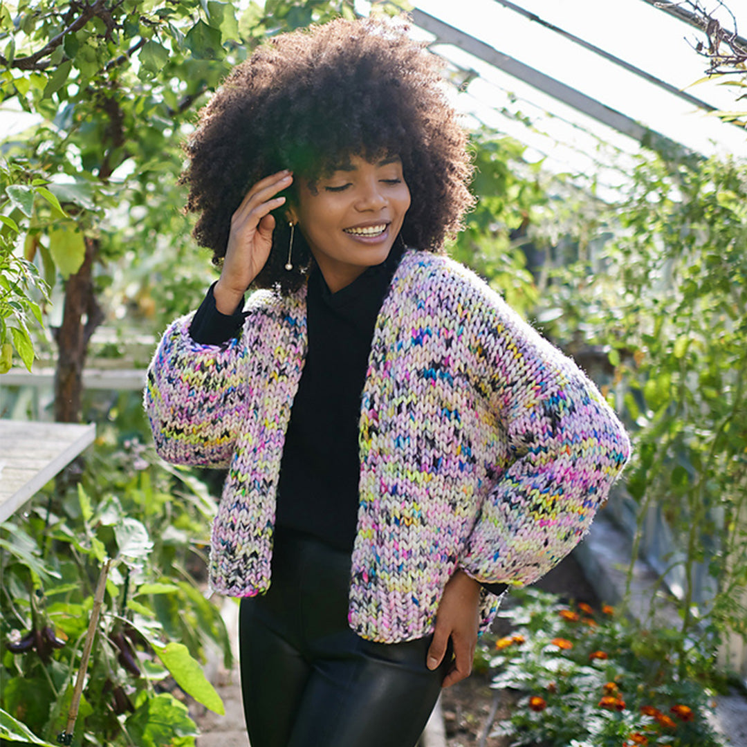 Our first feature is the cozy, fashion forward Comeback Cardigan by Hedgehog Fibres founder & designer Beata Jezek. Knit top-down in one piece, the cropped cardigan has a flattering drop shoulder & comfy three-quarter sleeves. The generous positive ease allows it to be worn over a variety of tops.
