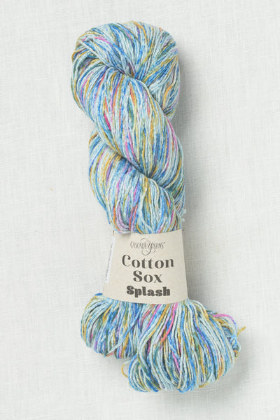 Cotton Sox Splash features a curated palette of happy, dappled colorways that give garments & accessories a fun painterly effect. The colors compliment tees, tanks, summer scarves & baby knits beautifully.