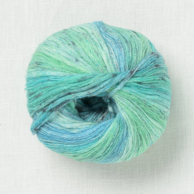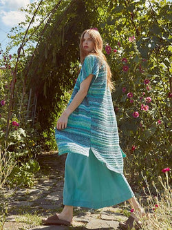 This light, floaty yarn is feather-soft & knits into ethereal garments & accessories with a gossamer quality. The summery ribbon-style yarn is spun with breathable cotton & recycled nylon. A chain construction ensures that garments will hold shape beautifully season after season.