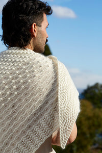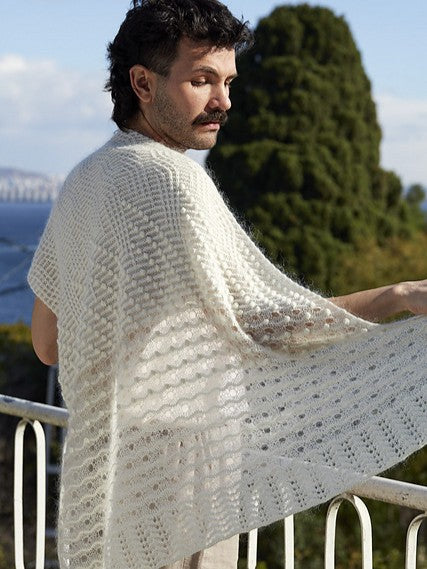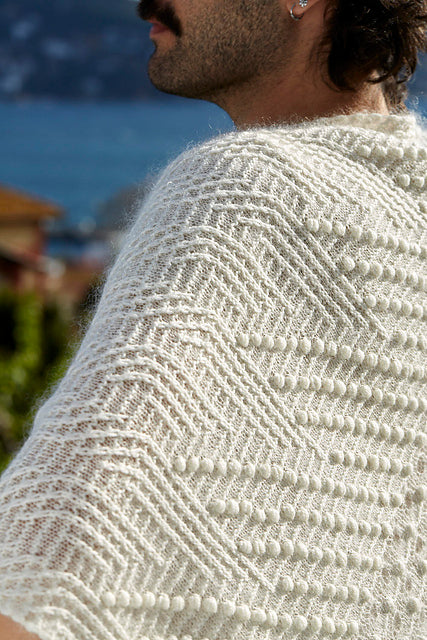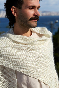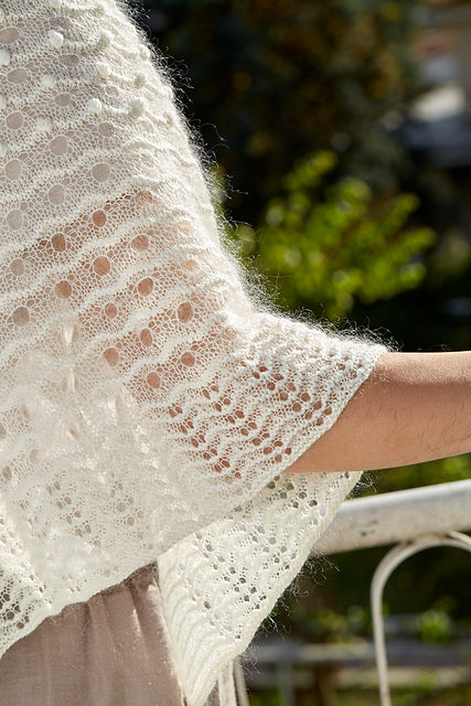 The first section symbolizes spiraling winds, blowing in dynamic motion. The next section captures the essence of air itself with nupps. While the following section focuses on releasing it with holes, embodying a sense of lightness and stillness. Finally, the shawl is trimmed with a wavy border, reminiscent of a gentle breeze.