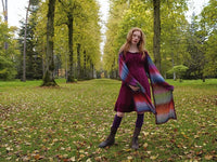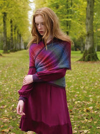 This is a rectangular stocking stitch wrap worked in a graduated stripe pattern, using twelve colours of Kidsilk Haze. The borders are worked in moss stitch.