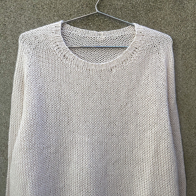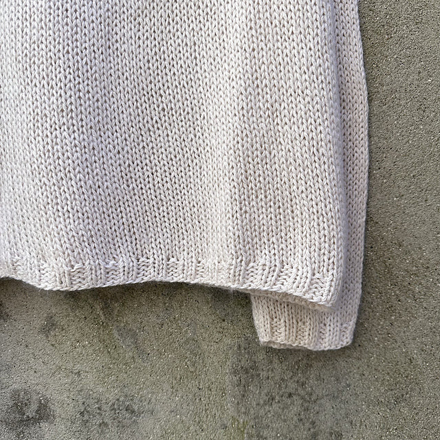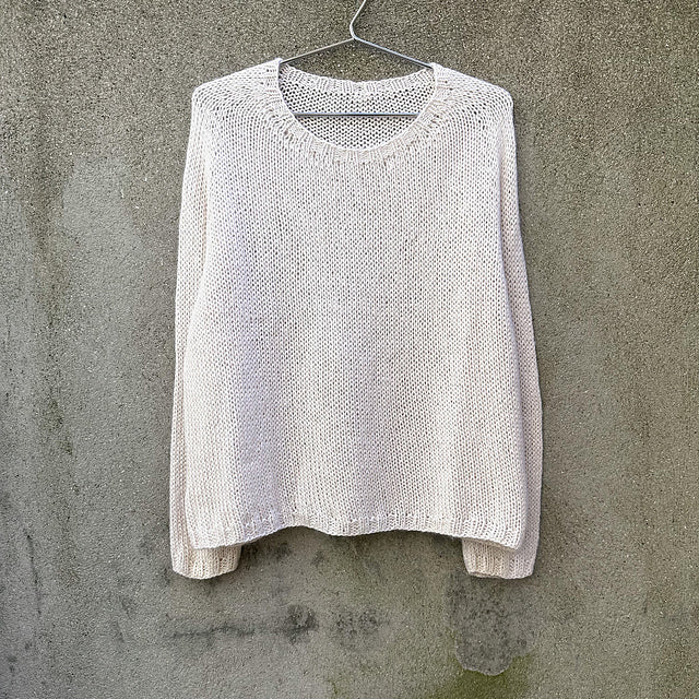 Alice Sweater is a soft and loose-fitting sweater with a round neckline and slim, slightly cropped sleeves. The sweater is worked in the round, from the top down using 2 strands of Merino or Pure Silk + 1 strand of Soft Silk Mohair held together throughout. The neckline is shaped with short rows before the yoke is further shaped with raglan increases. Body and sleeves are divided at the underarms, and each part finished separately.