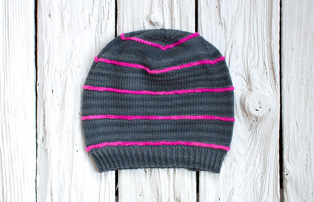 20 stitches and 33 rounds = 4” over Stripe Pattern on larger needle.