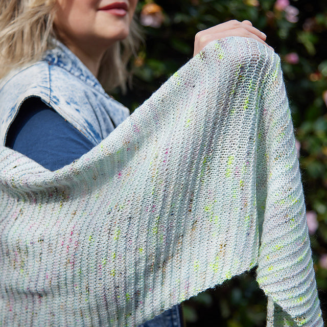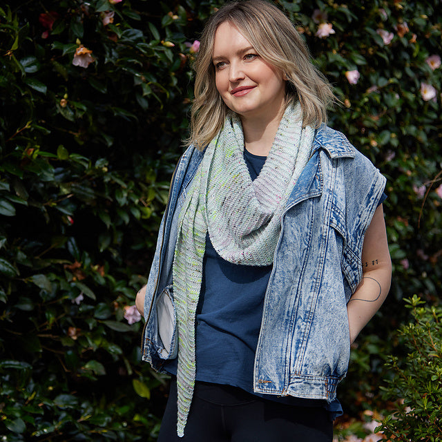 Shallow triangle scarf that has plenty of length to be wrapped around the neck, while being light and drapey. Easy to throw on, warm and cozy. The yarn is absolutely sublime and the two skeins really go far!