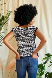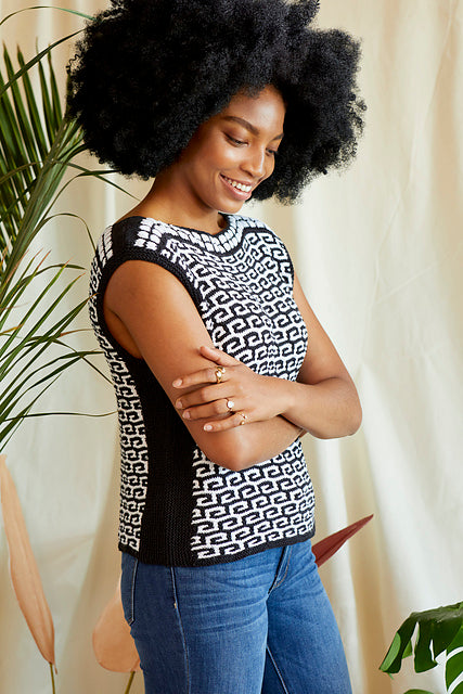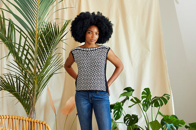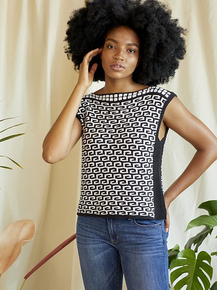 Tropical doesn’t have to mean bright colors! Inspired by black and white tilework, Areca is a joy to knit. It features bold patterning throughout. The modern silhouette makes this top easy to pair with anything for a fresh look that works on vacation or for a day at the office.