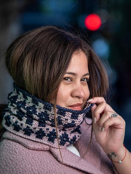 Samples shown in: 1 skein in Paris Night #052 and 1 skein in Valentina #689 1 skein in Gris #212 and 1 skein in Syrah Grapes