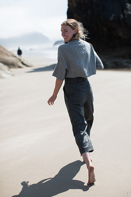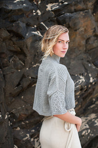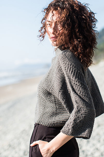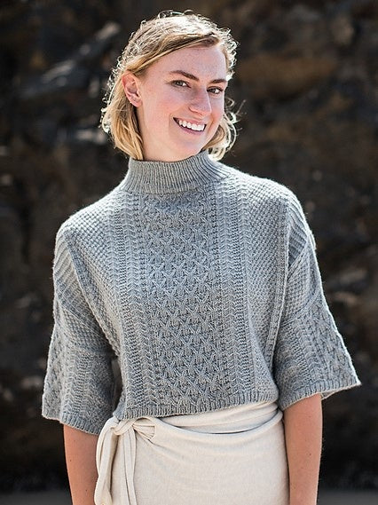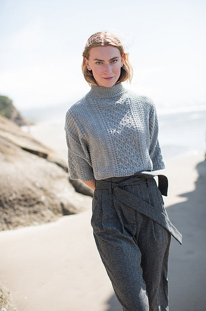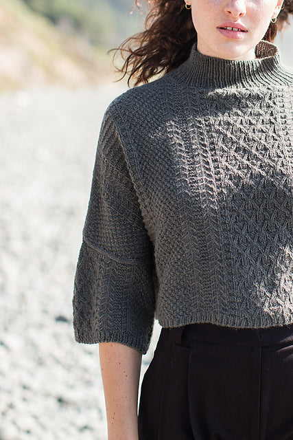 The pullover is worked in pieces from bottom up and seamed. The mock turtleneck is picked up and knit after the sweater is seamed.
