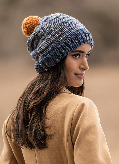 Knit with two hanks of soft and warm Woolstok Tweed, you have enough yarn for two complete hats knit in reverse order. Add a pop of color with an optional pom-pom with a third hank.