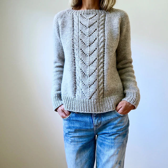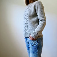 This super basic pullover is all about one simple detail: the wide cable and lace panel falling down the front. Since it’s worked in an aran to bulky weight yarn, the lace looks modern and the sweater knits up in no time! It is knit seamlessly in the round from the top down, with short row shaping at the neckline.