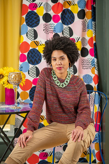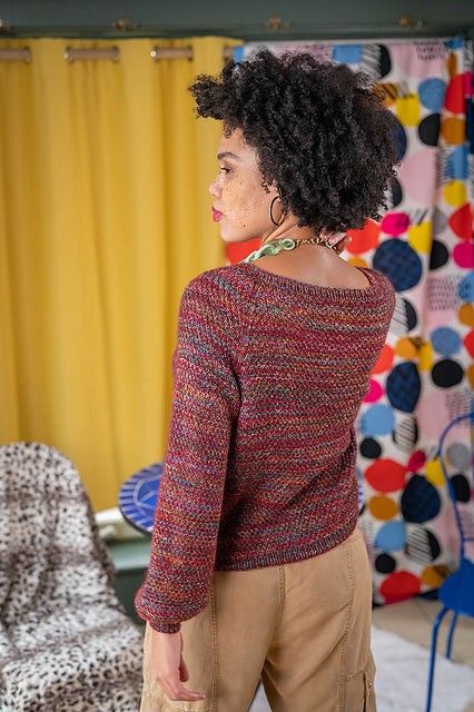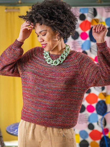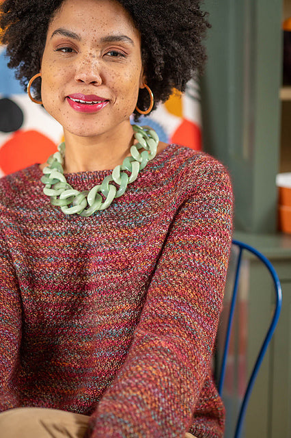 A staple wardrobe piece, Avalon is a textured knit pullover, worked in Carousel and Aerial held together. The body and sleeves are knitted separately in the round from the bottom up, then joined for yoke with raglan shaping. Neck is shaped using short rows.