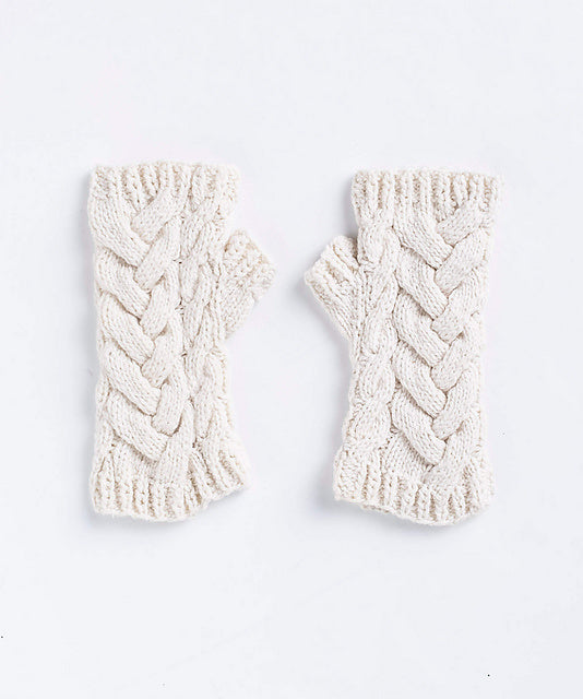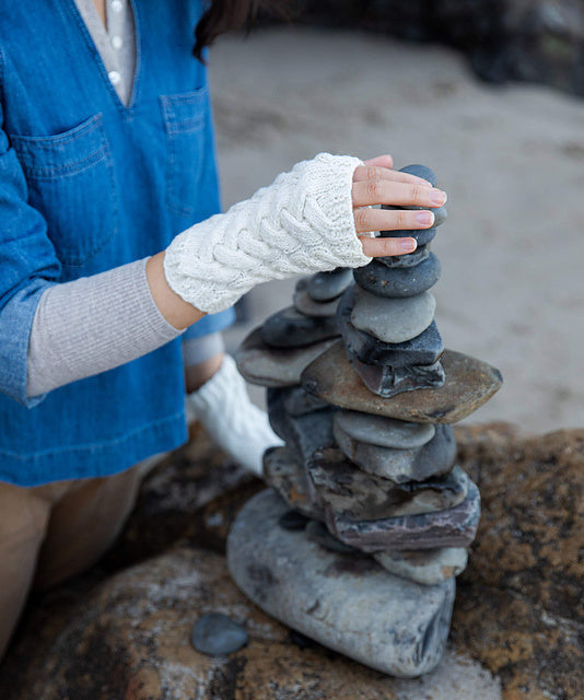 Keep warm without sacrificing functionality with the elegant pragmatism of the Ballantine mitts. A dense, cabled braid anchors the top of these fingerless mitts, fading to small twists on the palm for fuss-free, everyday use. Slightly elongated cuffs are perfect for tucking into your coat sleeve, while a thumb gusset provides just the right fit — all in Arbor’s springy Targhee wool or Dapple’s dreamy blend of Organic Cotton and Merino.