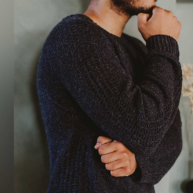 The BATU pullover is worked from the top down in the round. The increases on the yoke are evenly spread over the round. A structured pattern is incorporated in the centre of the sleeves and at the sides of the body; the remaining parts of the pullover are worked in stockinette stitch with ribbed cuffs and hem.