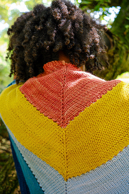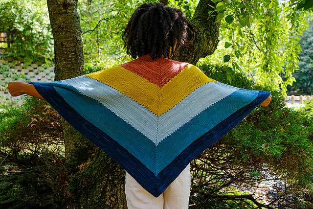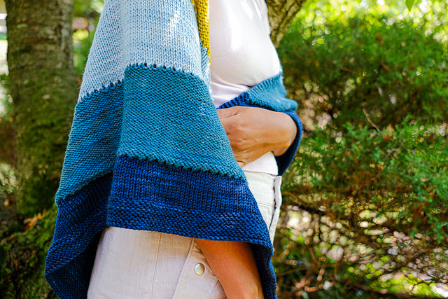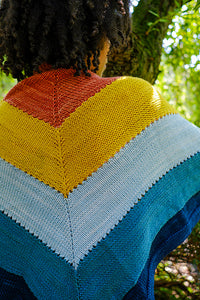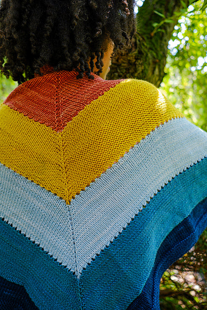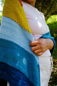 The Belina Shawl is a colorful wrap, worked in alternating sections of Stockinette and Reverse Stockinette patterning for a easy textural shawl.