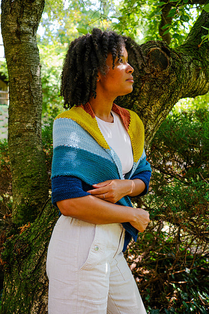 Jocelyn chose 5 colors of Alegria Grande, our plied worsted weight yarn, in a beautiful autumnal palette: Habanero (muted orange), Canary (yellow), Oxygen (light bright blue), Teal (blue-green), and Oceano (deep blue). See the Alegria Grande palette here to explore the full range of colors!