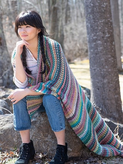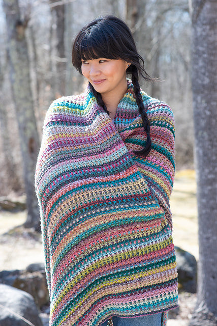 Bente is a mosaic stitch blanket using one color of Wizard. Working from two balls simultaneously creates a dynamic color change throughout the blanket.
