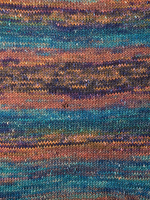 Ideal for warmer weather, Summer Sesame is a DK/light worsted weight, self-patterning yarn spun from a lightweight blend of cotton, acrylic & nylon. As the colors ebb & flow, the pattern is reminiscent of a horizon or natural landscape. A wonderful yarn for spring pullovers, tees, wraps & ponchos.