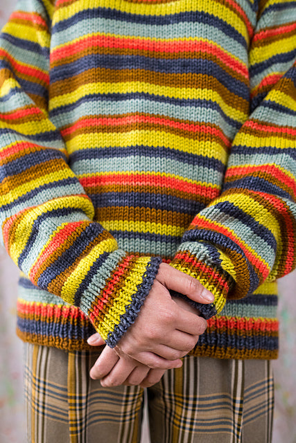 A few strong colors combine with supporting neutrals for Bert’s high-energy look. Mismatched stripes at the raglan edges both draw attention to the shaping and give a casual vibe. The look of “random” stripes comes from starting different pieces at different points in a set sequence; the pattern includes a blank template for you to color in to try out your own ideas!