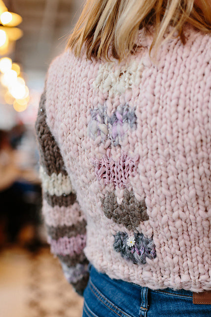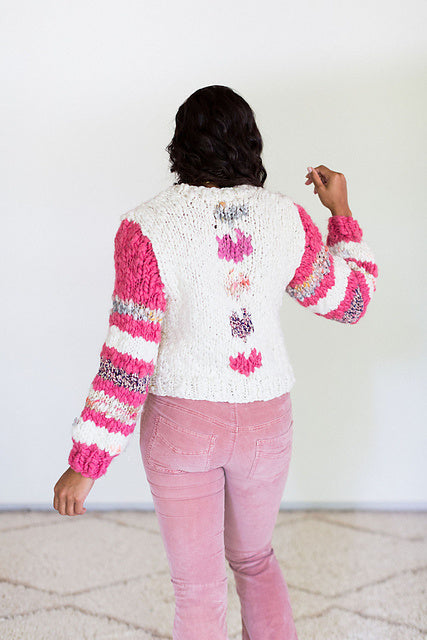A super fun and easy sweater to make, it uses the intarsia method of color work, adding big blocks of color without having floats of stranded color work. Show your love with a large heart on the front and five smaller hearts down the center back.