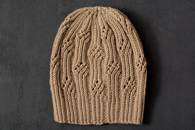 Polished twisted rib columns flow into a simple diagonal eyelet Blossom stitch to create a classic, slightly slouchy hat. Using 1 skein of Harvest Worsted, it’s a quick knit with an impressive and timeless result.