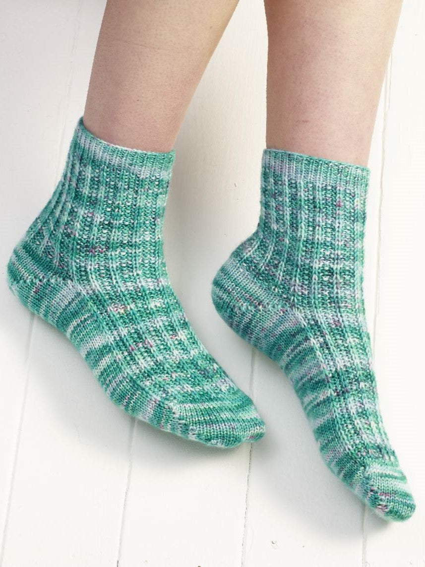 These pretty socks are knitted cuff down with a textured moss stitch and short row (wrap and turn) heels and toes!