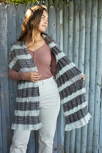 Playing with yarn weight - of fingering weight Fino and laceweight Cabrito - and wide ribs creates a lightly pleated effect in this simple oblong wrap.