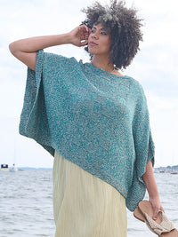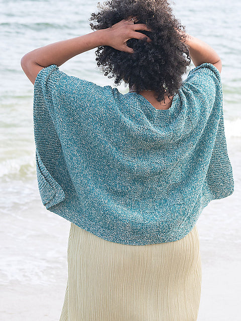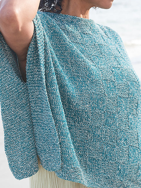 Front and back are worked separately and seamed at shoulders and inside the garter stitch side panels at the sides. Poncho features a basketweave stitch pattern on front and back center panel.