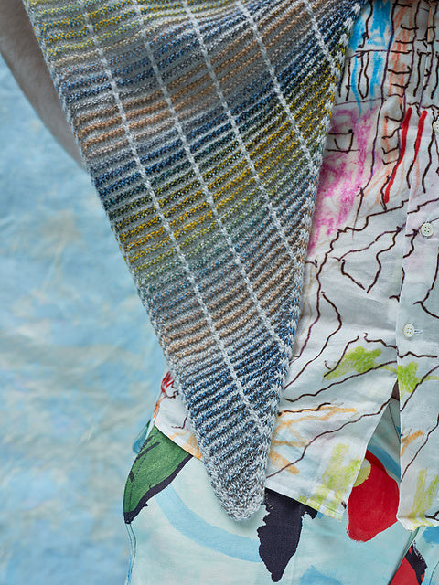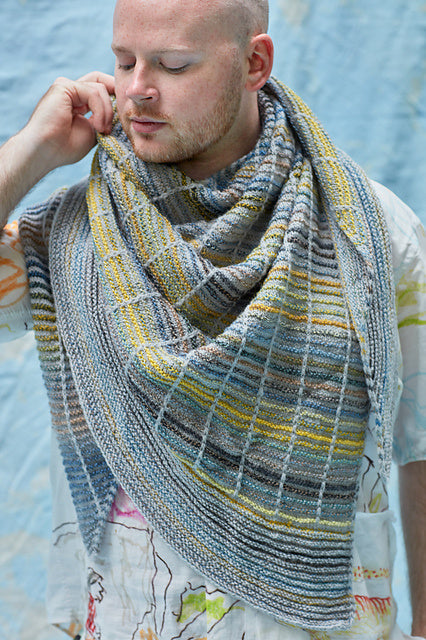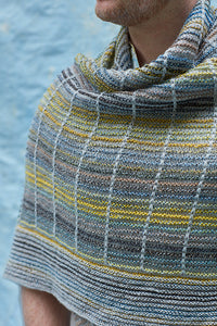 This triangular shawl is knit sideways starting with a tiny corner increasing to the border. Stripes and slipped stitches decorate the linear lines of the fabric. One solid yarn combined with one self-striping yarn produce an exciting project that’s easy to knit and fascinating to watch the colors unfold. This pattern is a great beginner shawl project with simple stitches. You can stop early for a smaller shawl or knit more repeats for a larger shawl.