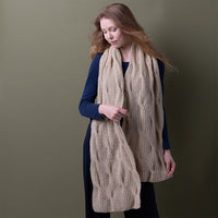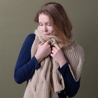 The BRAIDED WAVES scarf is knitted in half brioche stitch in rows and with two strands of yarn. It gets its unique structure from the cables that are integrated into the half brioche pattern. Edge stitches are worked on both sides of the pattern.