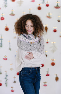 This knit-from-the-center crescent shawl has a little something for everyone with its mixture of Knit Collage yarns and cables and pointelle stitch patterns. The cables add texture while the pointelle stitches keep things light and breezy, making this the perfect shawl to keep you cozy, but not too hot! This is a perfect project to try if you’ve never experimented with our yarns before because in our mini skein sampler kits, you get to try out five yarns in one go. It’s a lot of fun to knit with and mix such unique yarns together!