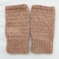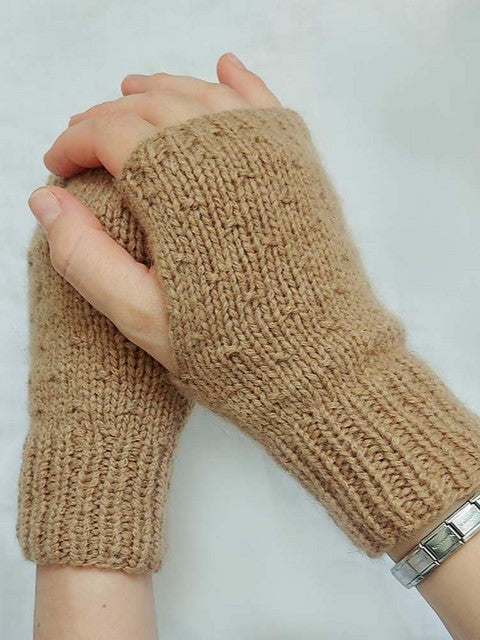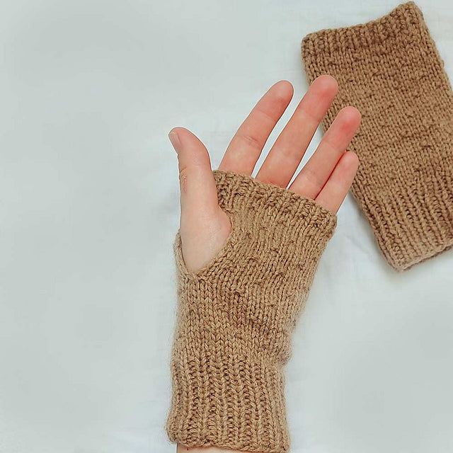 The wrist warmers are knitted in the round from the cuff to the fingers, using either double-pointed needles or a circular needle. A section is worked in rows only for the thumb opening. The wrist warmers start and end with a 1x1 ribbed edge; in between, they are worked in a textured pattern of knit and purl stitches.