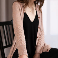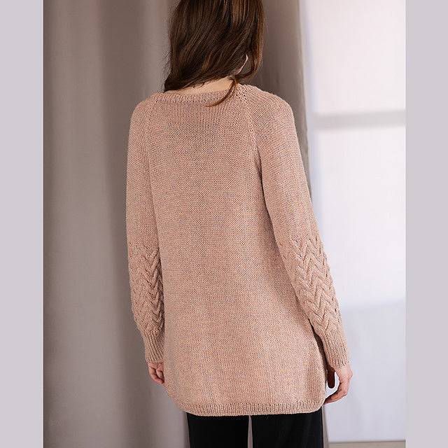 The ALEESHA cardigan is worked seamlessly top down. Work begins at the neckline which is shaped with short rows. Increases for the shoulders are made along four raglan lines. Once the sleeves are separated, the body is finished separately down to the hemline. The sleeves are then knitted in rounds down to the forearms with a cable pattern, ending with ribbed cuffs.