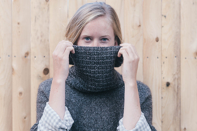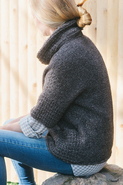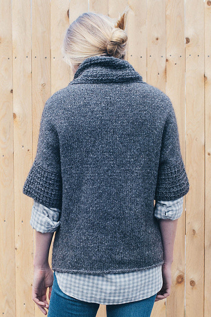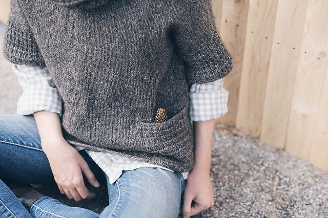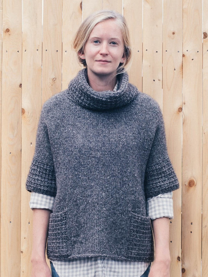A cozy layer with pockets, perfect for transitional weather. Worked in the round from the bottom up at a relatively loose gauge, this modified drop shoulder piece is quickly finished. We love the simple broken rib details at the hem, sleeves, and toasty cowl.