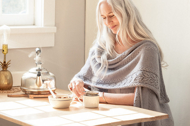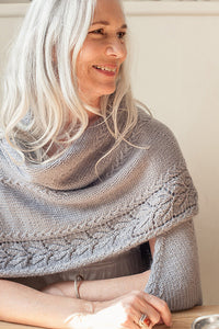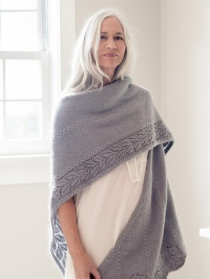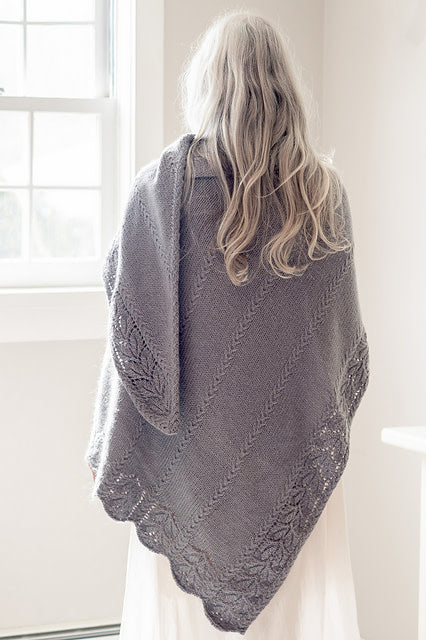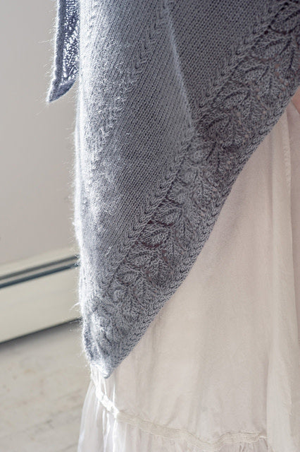 Chaga is knitted from side to side, beginning at its wide left edge, decreasing to the right tip. The left border is continued just at the right edge as the shawl is decreased, with a subtle, pretty cable rib in the body. This ample shawl is so soft in our mohair/merino Crane.
