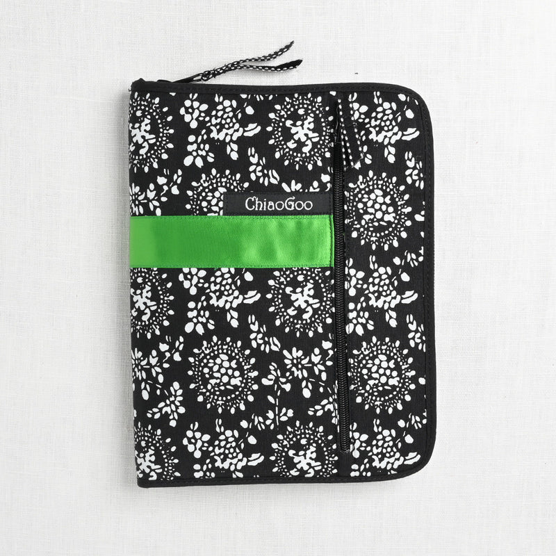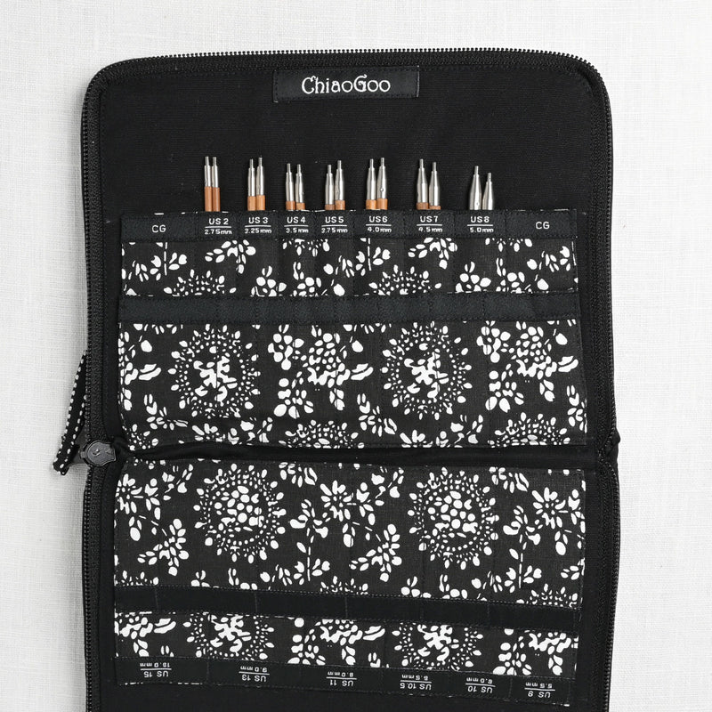 The needles come in a lovely, zippered case with a labeled pocket for each needle size, as well as a separate zippered compartment for notions.