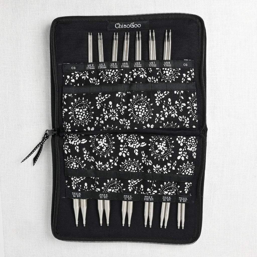 Have the right size needle at your fingertips when you need it. Pointed, lace tips made from surgical stainless steel allow for quick, smooth, snag-free knitting. The flexible, nylon-coated, memory-free cords offer a lifetime of delight. This complete kit includes 5” tips sized US 2-15 (2.75-10mm), two 14” (35cm) cables, two 22” (55cm) cables, two 30” (75cm) cables, ring stitch markers, two keys, needle gauge, two end stoppers, one cable connector & a zippered, book-style case.