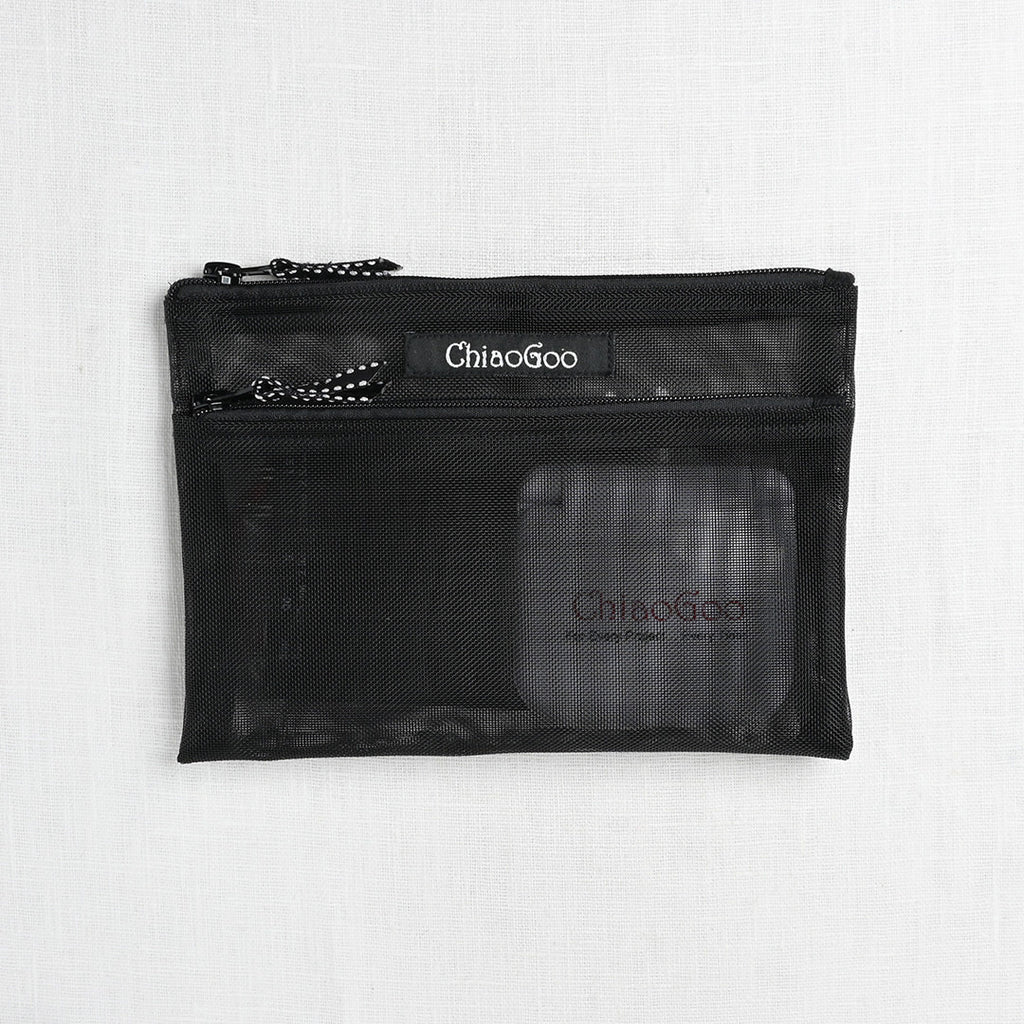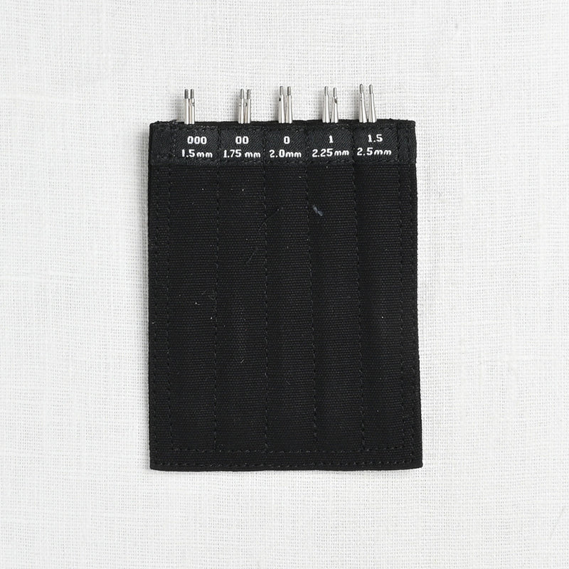 Have the right size needle at your fingertips when you need it. Pointed, lace tips made from surgical stainless steel allow for quick, smooth, snag-free knitting. The flexible, nylon-coated, memory-free cords offer a lifetime of delight. This adorable kit includes five, 4” tips sized US 000-1.5 (1.5-2.5mm), two 8” (20cm) cables, 14” (35cm) cable, 22” (55cm) cable, assorted ring stitch markers, 4 keys, needle gauge, two end stoppers, 2 cable connectors, heart shaped rubber grip, tool kit box & a zippered, black mesh pouch.