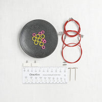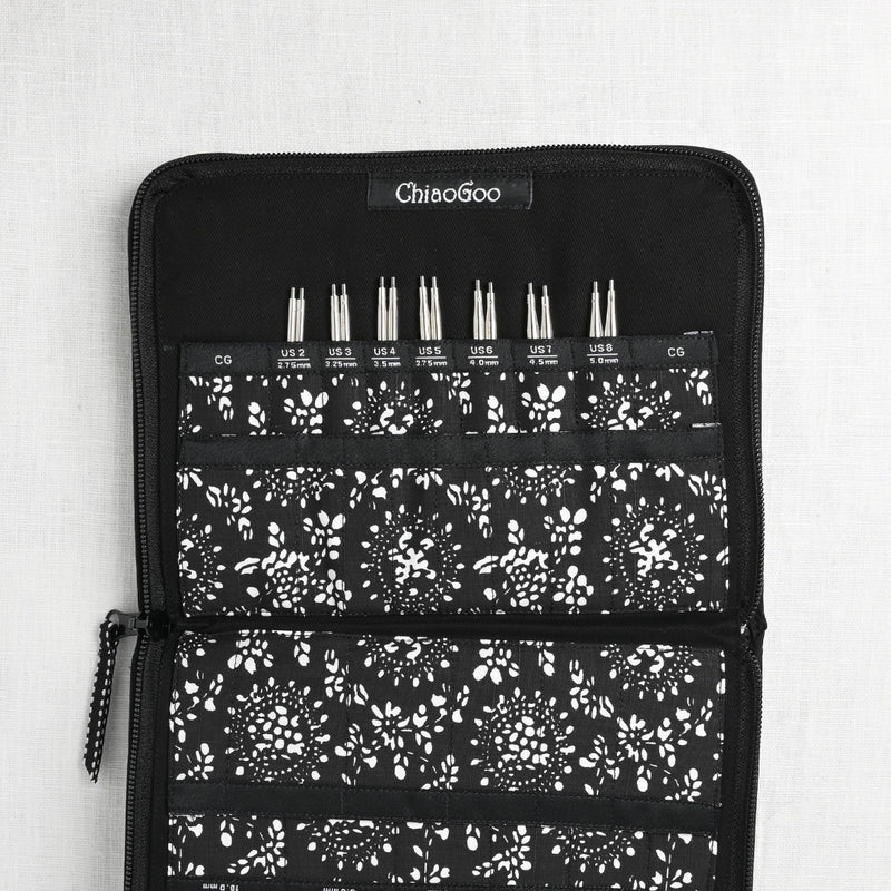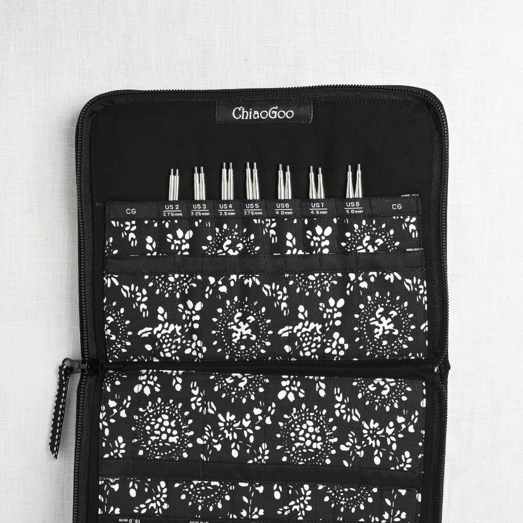 Have the right size needle at your fingertips when you need it. Pointed, lace tips made from surgical stainless steel allow for quick, smooth, snag-free knitting. The flexible, nylon-coated, memory-free cords offer a lifetime of delight. Kit includes seven, 4” tips sized US 2-8 (2.75-5mm), two 8” (20cm) cables, 14” (35cm) cable, 22” (55cm) cable, assorted ring stitch markers, two keys, needle gauge, two end stoppers, one cable connector & a zippered, book-style case.