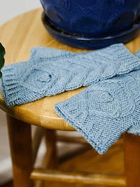 The Chickering Sage Mitts are a companion to the Chickering Sage Hat. Here the same cable motif is offset by a ribbed detail on the palm.