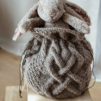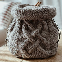 The Chunky Comfort Keeper Bag is worked from the bottom up in one piece. The bottom is worked flat and stitches are picked up and knit from the base before joining in the round. The body is worked using two different cable patterns. After the body, a tube is created where the cords are threaded through to close the bag. The bag is finished with a Zigzag Seed stitch pattern edge.