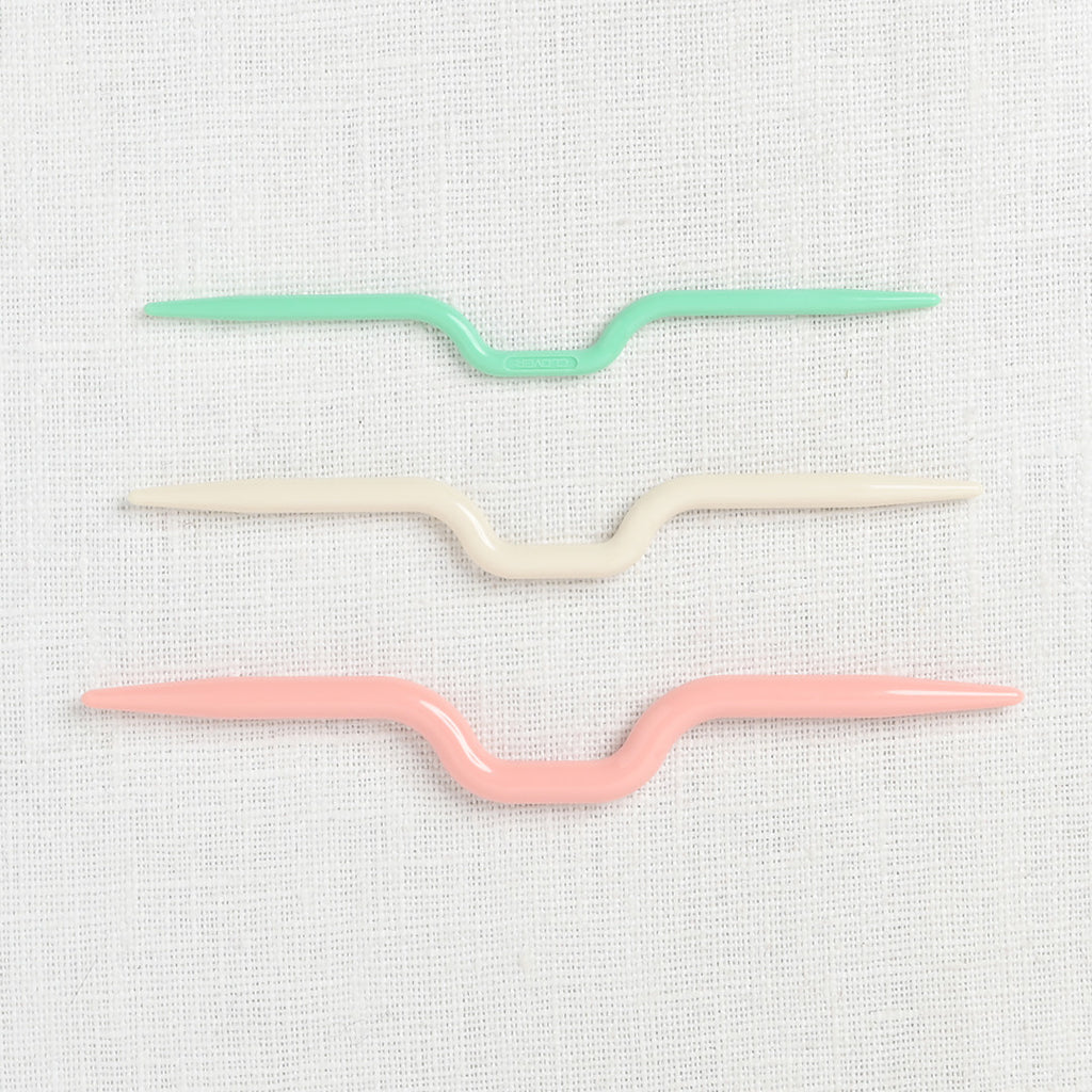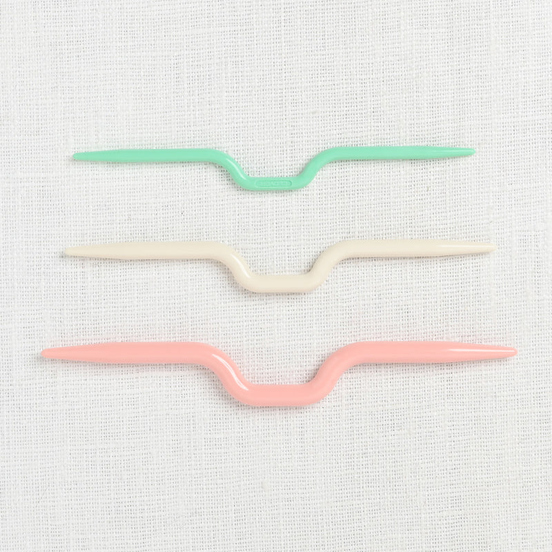 Three assorted sizes of needles help you to create gorgeous cable patterns. I slight divot keeps stitches safe, while still allowing quick knitting. Perfect for light to chunky weight yarns. Includes 3 assorted sizes of needles.