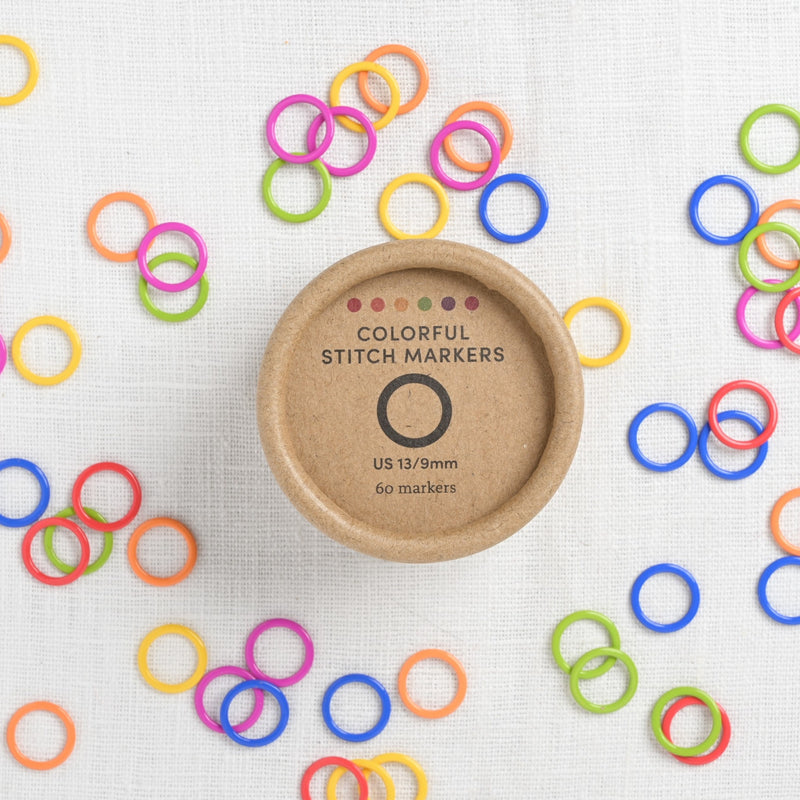 Delight in every aspect of knitting with these thin, smooth, steel ring stitch markers by Coco Knits. Ring stitch markers are perfect for keeping track of patterns, increases, decreases, as well as marking the beginning of round. Fits up to size US 13 (9mm) needles. Includes 60 markers & cylindrical storage box.