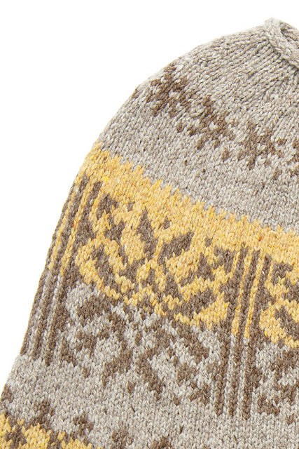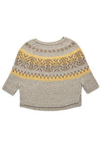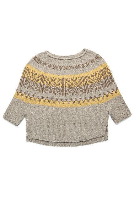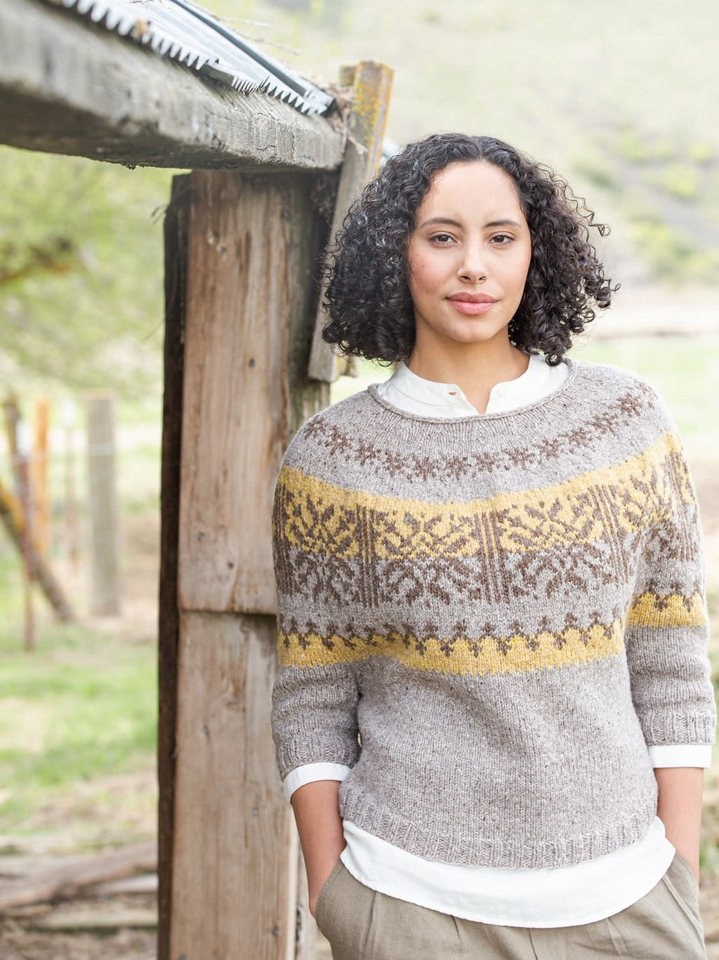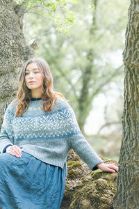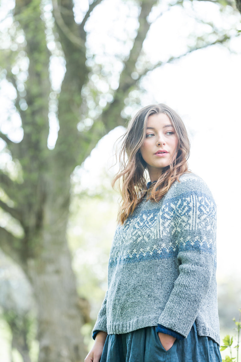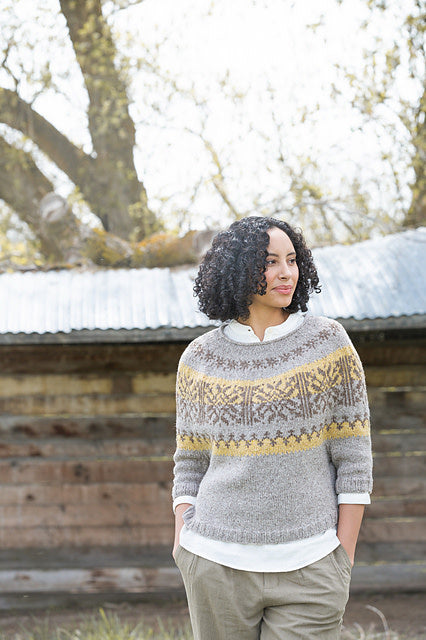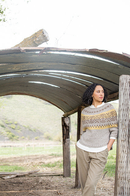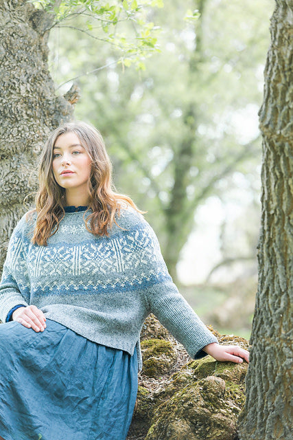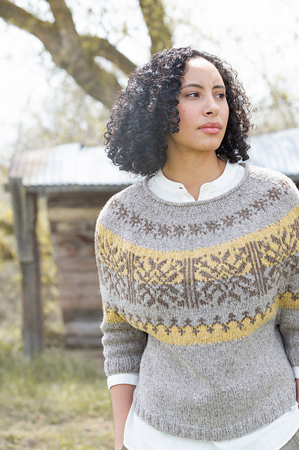 The on-trend silhouette of the Collomia pullover offers a dramatic canvas for a timeless stranded colorwork yoke. The woolen-spun texture of Shelter yarn softens the bold stripes and ornate snowflake motifs. With seams only at the underarms and knit at a worsted gauge, Collomia is just as alluring to knit as it is to wear.