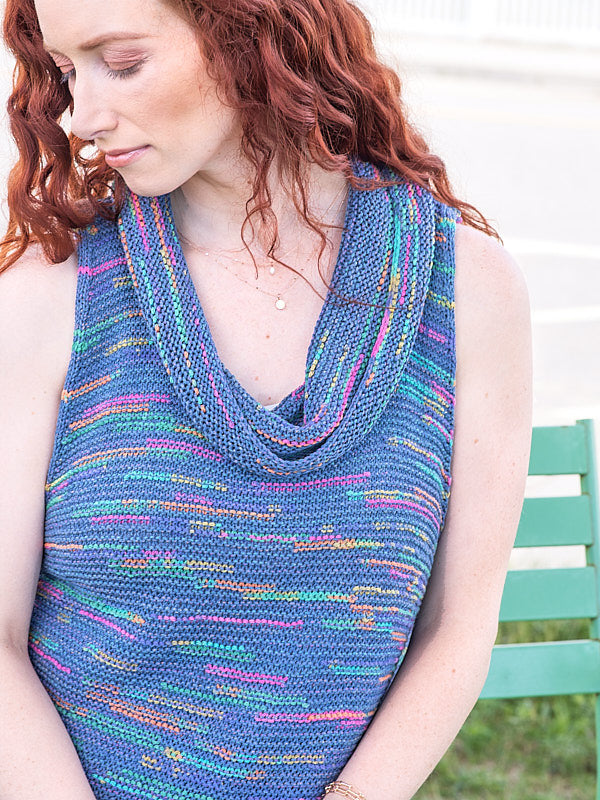 Comillas is a cozy cowl neck tank. Worked from the bottom up, it’s a great piece to layer in summer.
