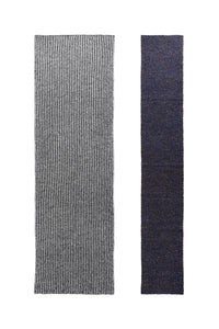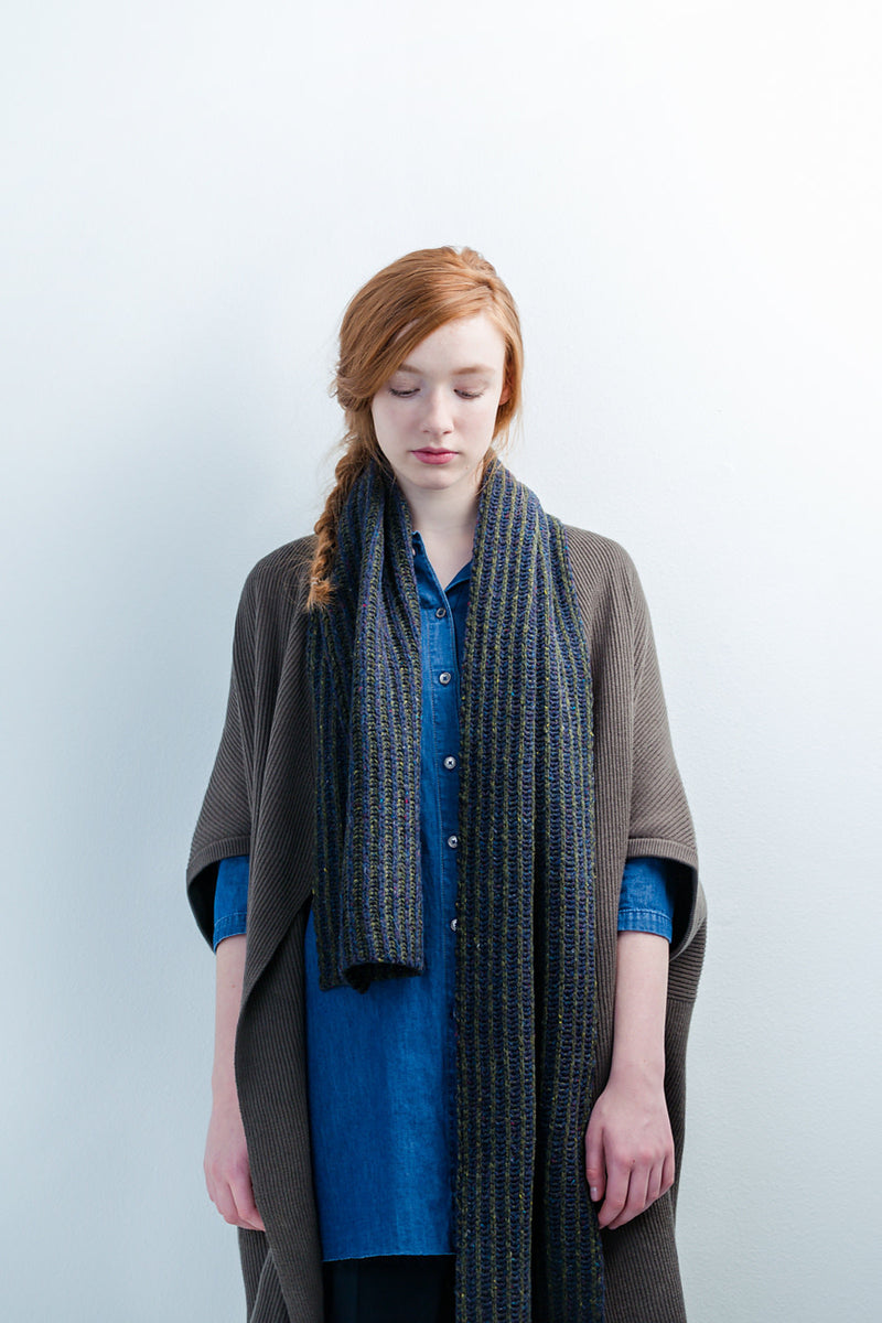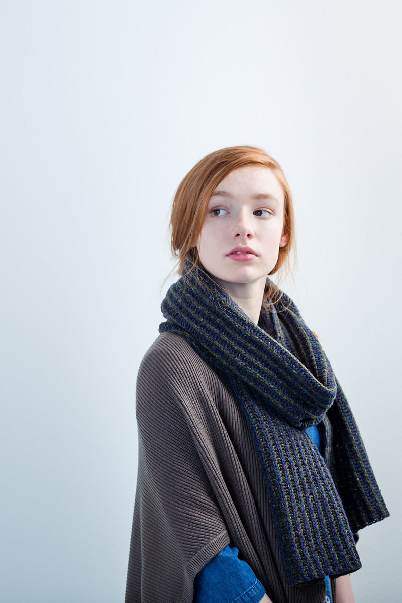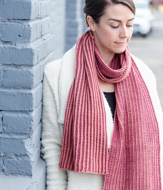 Two different yarns in contrasting colors combine to create a simple but intriguing scarf. Each pair of rows is worked alternately with Shelter and Loft in brioche stitch. Amplify the herringbone effect with a high-contrast pairing — like the sample is knit in Cast Iron and Fossil — or use closely related hues for a gentle glow. Imagine a festive Crosshatch in Long Johns and Cinnabar or a moody version blending Stormcloud and Faded Quilt. Stretch-blocking on wires opens up the fabric to further expose the stitch pattern and give the finished fabric a beautiful drape.
