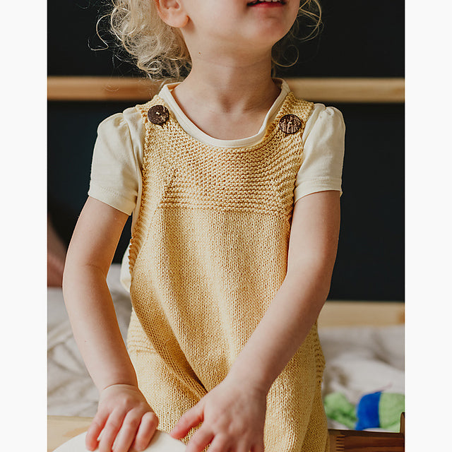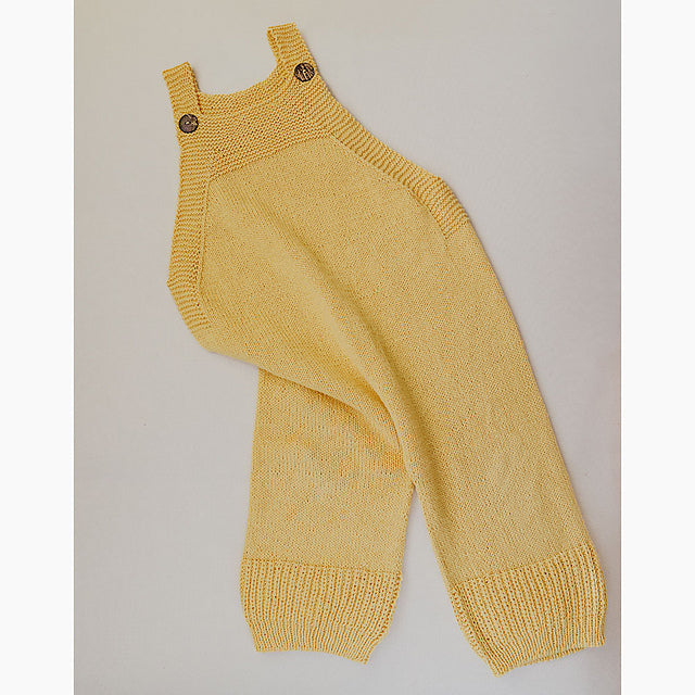 The casual DANA overalls are worked from the legs upward. The 7/8-length legs are worked in rounds; a section above the cuffs is worked in half fisherman’s rib, then the legs continue in simple stockinette stitch. Increases are worked on the insides of the legs for the crotch. The legs are then joined together and the body of the garment is continued in rounds. The work is divided for the bib, and the front and back sides of the garment are continued in rows. Wide garter stitch panels run along the front of the garment on both sides before merging into the buttonhole band. On the back of the garment, the whole bib is worked in garter stitch, ending with the straps.
