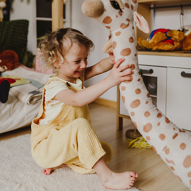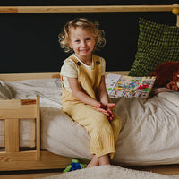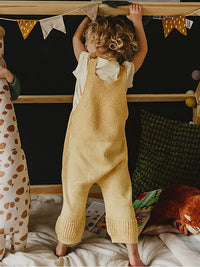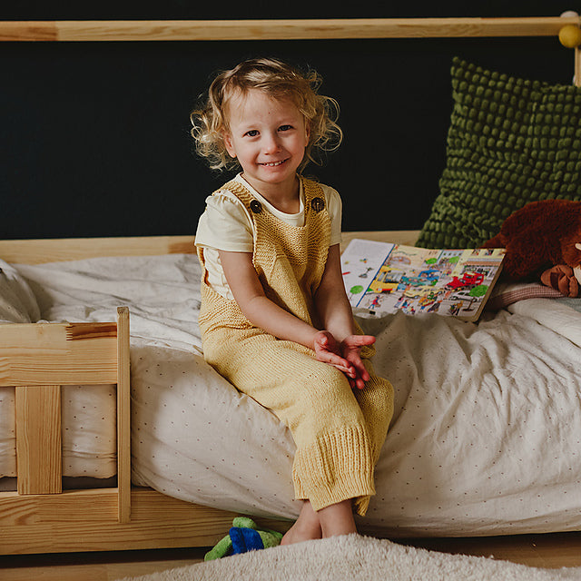 The overalls have a very loose fit with 7/8-length legs. The generous positive ease makes for casual wearing comfort. The variable length of the straps allows the overalls to be adjusted to the size of the child so that they can be worn for a long time.
